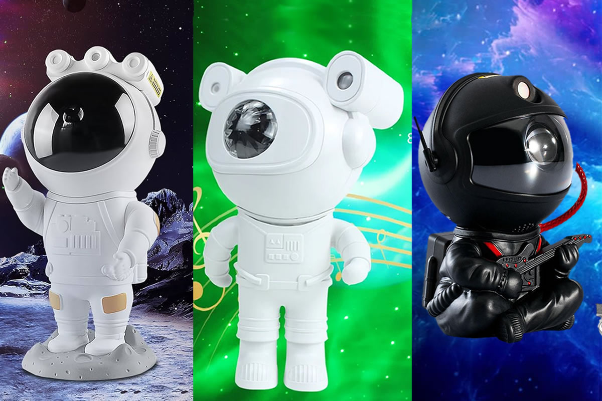 Projetor Astronauta Shenzhen Kinlan Technology (Alguns modeos com caixa de som): Para os amantes da música e do espaço, este modelo combina projeção estelar com uma caixa de som integrada. Perfeito para criar uma atmosfera envolvente em qualquer ambiente. Peso: 610g Tamanho: 24x11x12cm